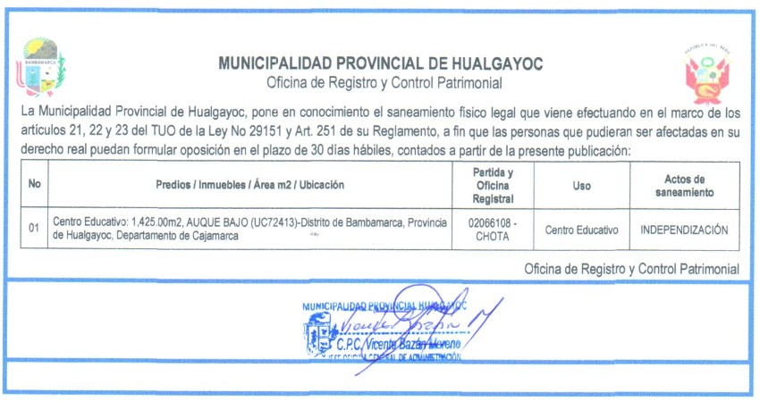 20 de octubre de 2022: La Municipalidad Provincial de Hualgayoc, pone en conocimiento el saneamiento físico legal que viene efectuando en el marco de los artículos 21, 22 y 23 del TUO de la Ley N° 29151 y su Reglamento, a fin que las personas que pudieran ser afectadas en su derecho real puedan formular oposición en el plazo de 30 días hábiles, contados a partir de la presente publicación.