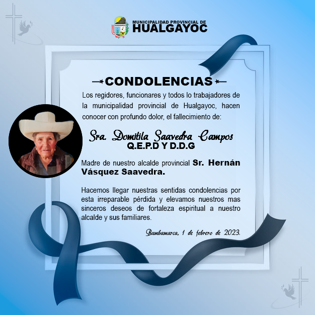 Los regidores, funcionarios y todos los trabajadores de la Municipalidad Provincial de Hualgayoc, hacen conocer con profundo dolor, el sencible fallecimiento de: Sra. Domitila Saavedra Campos Q.E.P.D. y.D.D.G., Madre de nuestro alcalde provincial Sr. Hernán Vásquez Saavedra.