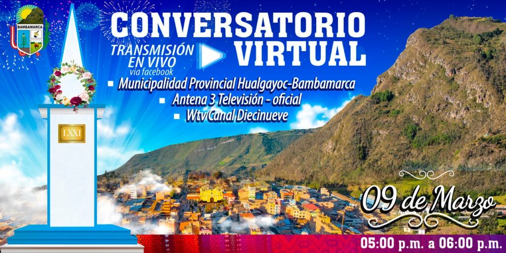 «Conversatorio Virtual» con la participación de invitados especiales quienes tocarán aspectos históricos de nuestra ciudad, en el marco de las actividades del 71 Aniversario del Traslado de la Capitalía, mediante transmisión en vivo en nuestra página de Facebook de la Municipalidad Provincial Hualgayoc-Bambamarca