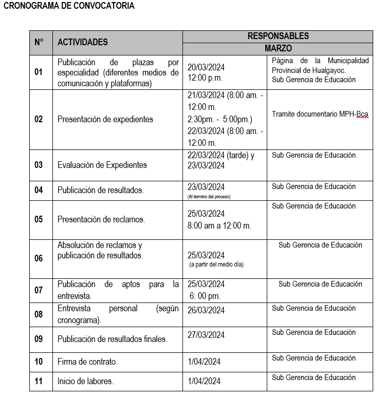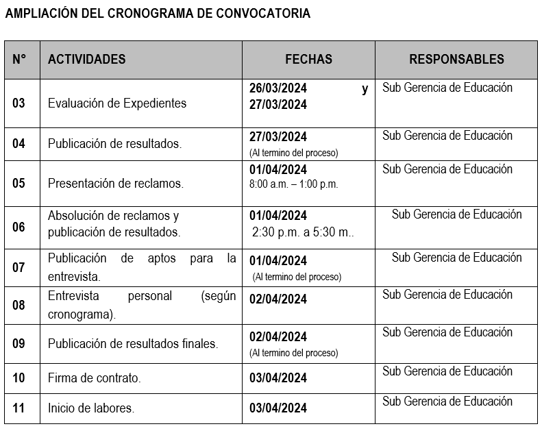 El comité de evaluación de plazas del personal Docentes, Psicólogos, Asistentes Administrativos y Personal de Servicio, para laborar en las Instituciones Educativas Públicas de la zona urbana y rural, así como Instituciones de Gestión Comunal-IEGECOM para el año académico 2024 del distrito de Bambamarca, comunica que se amplia el cronograma de presentación evaluación del proceso, quedando de la siguiente manera: